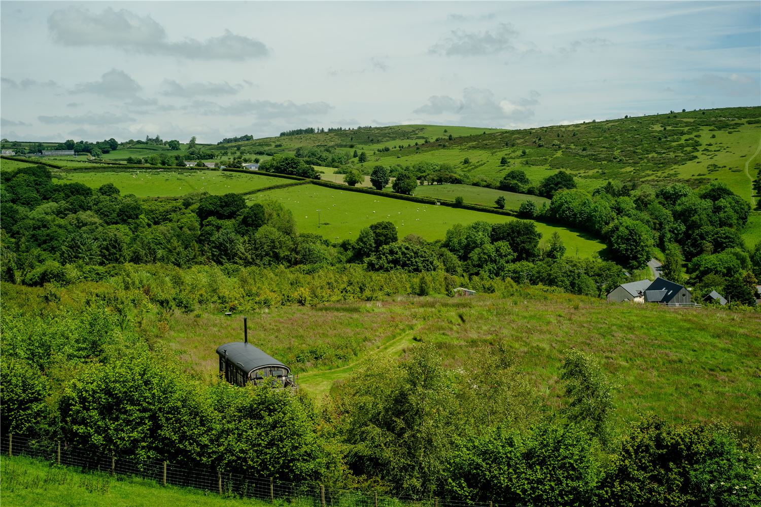 Up here, it's just you. The wagon rests on its own in 2 and a half acres of our 'top' field. Look left, gaze right, down the valley, and up to the stars, whatever the weather. Hello ewe……